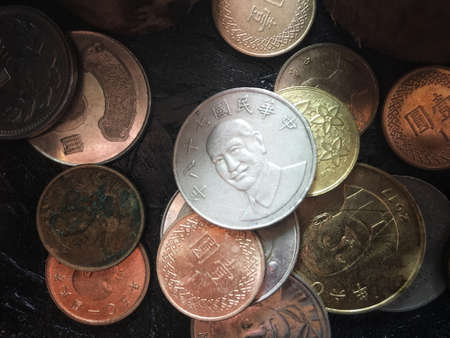 Colorful old coin stacking on black wooden table for business and financial reference background
