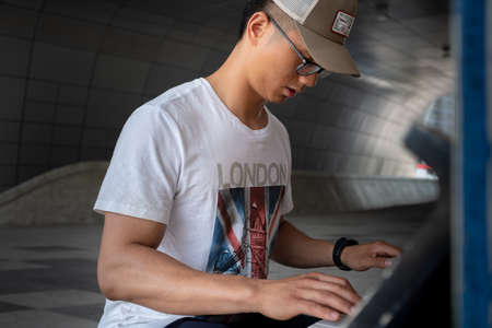Seoul, South Korea - June 2, 2019: Young Asian piano player, at the Dongdaemun design plaza