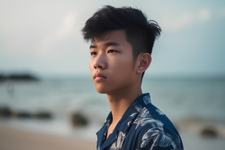 Portrait of a young asian man on the beach at sunset