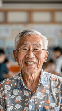 Elderly Asian man smiling broadly in a bright room at a social gathering or meeting. Concept of senior happiness, positive aging, joyful life, elderly community, social interaction, community event. Vertical.