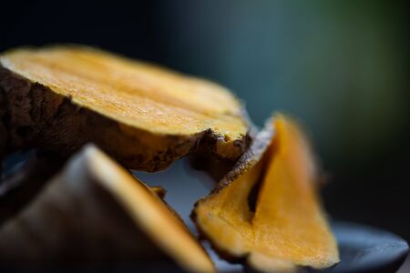Close up yellow turmeric herb on wood table.