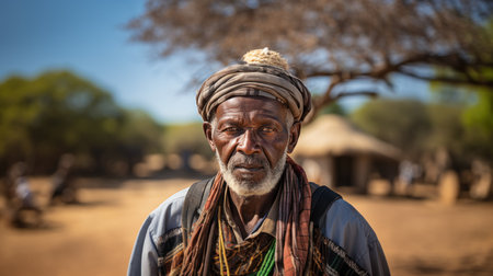 An elderly man from Afghanistan showcases his weathered face, reflecting years of wisdom and resilience against a modest backdrop of nature, embodying the rich culture of his homeland. Generative AI.