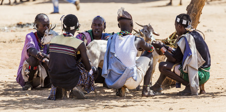 TURMI, OMO VALLEY, ETHIOPIA - DECEMBER 30, 2013: Unidentified Hamar man at village market. Weekly markets are important events in Omo Valley tribal life.