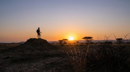 A lone hiker stands silhouetted on a hill, gazing at a breathtaking sunset over a vast landscape dotted with acacia trees, evoking a sense of adventure and tranquility.