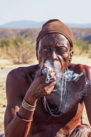 Opuwo, Namibia - Jul 07, 2019: Old Namibian man smoking a cigar, seen in Opuwo, the capital of the Kunene Region in north-western Namibia, Africa