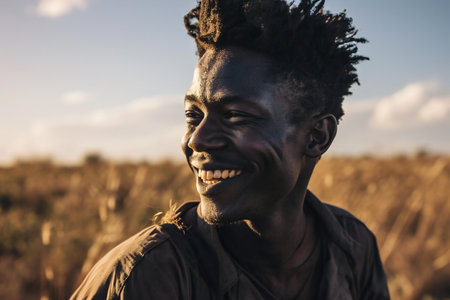 Portrait of a young African man smiling in the grassland.