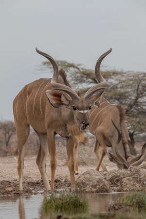 Greater Kudu drinking and standing at a waterhole in the Etosha national Park in Namibia