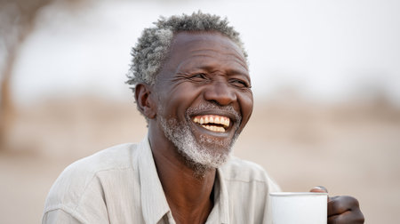 Laughing old man with gray hair in Africa close up with a mug of water, concept of drought and water shortage