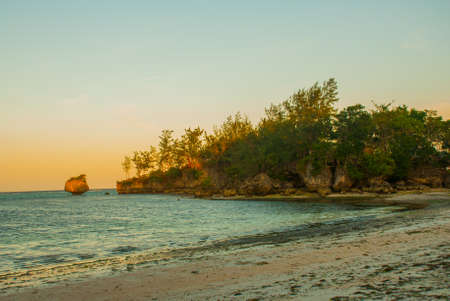 A stunning view of a serene island during sunset, with gentle waves lapping at the sandy shore, showcasing lush greenery and a tranquil atmosphere perfect for relaxation.