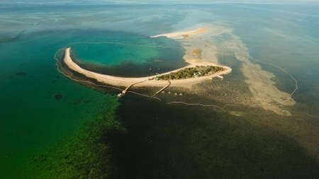 Sandy island with sand bar surrounded by coral reef and blue sea in honda bay, aerial view. Coral atoll with a sandy beach. Summer and travel vacation concept, Philippines, Palawan