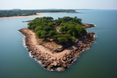 An AI generated illustration of an aerial view of a beach and forest filled island with sand