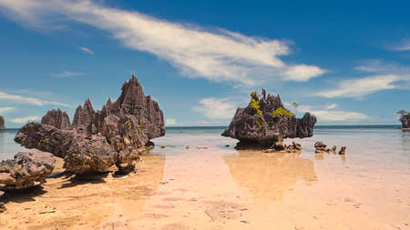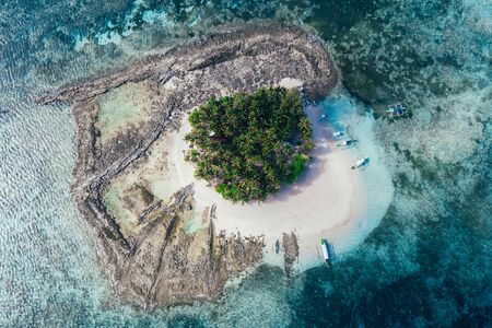 Patawan island. Small tropical island with white sandy beach. Beautiful island on the atoll, view from above. Nature of the Philippine Islands.