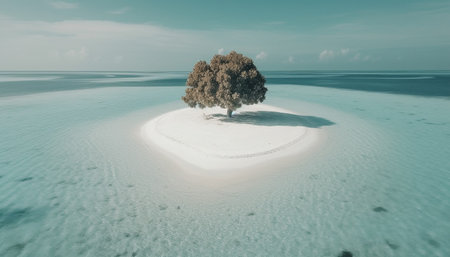 A vibrant image presents a solitary tree rooted on a rocky island in the middle of the ocean. The composition features a clear blue sky and calm water, with the island exhibiting textured rock and lush greenery. The lighting suggests daytime with the potential for use in various commercial and editorial contexts.
