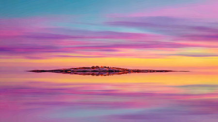 Serene seascape at sunrise or sunset, featuring a calm body of water mirroring a vibrant, colorful sky. The colors are blended and softened, creating a peaceful and dreamlike atmosphere. A small island is visible at the horizon. The reflections of the sky in the water are detailed and vivid, complementing the vibrant hues in the sky.