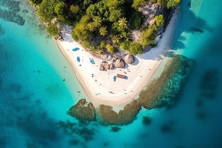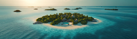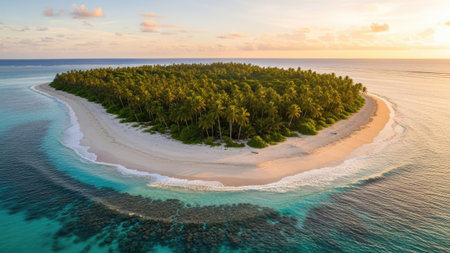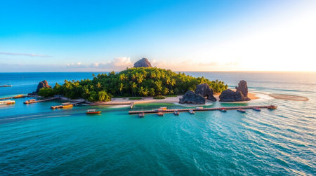 Aerial view of tropical island surrounded by clear turquoise water, featuring lush greenery and sandy beaches. serene landscape evokes sense of tranquility and paradise