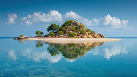 A breathtaking view of a small rocky island with lush greenery, perfectly reflecting in the tranquil waters beneath a clear sky, emphasizing peace and natural beauty.