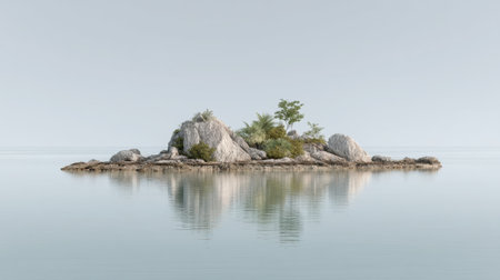 A peaceful landscape featuring a rocky island surrounded by calm waters, beautifully reflecting the serene atmosphere and soft mist in the background, ideal for relaxation.