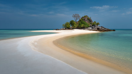This peaceful image showcases a tranquil island amidst calm turquoise waters, reflecting a pristine blue sky. Ideal for conveying serenity and natural beauty in various projects.