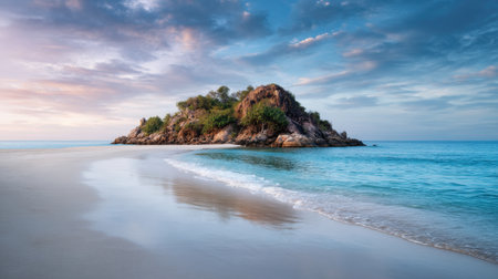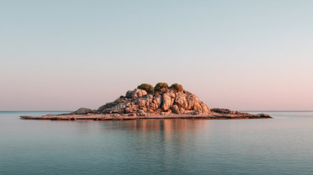 A tranquil coastal island at dusk, showcasing soft pastel colors and calm waters that beautifully reflect the serene landscape and natural beauty of the environment.