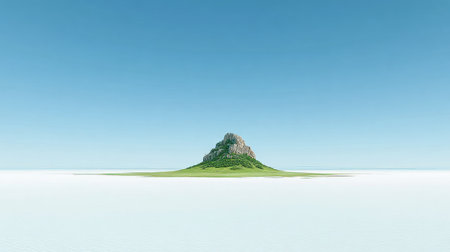 Minimalist depiction of a small, isolated landmass featuring a rocky, tree-covered peak surrounded by bright green foliage, set against a wide, featureless white foreground, possibly representing snow, salt flats, or stylized water, under a clear, expansive pale blue sky.