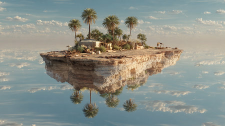 A serene island oasis rises smoothly from calm waters, surrounded by lush greenery and sculptural rocks. This tranquil landscape invites relaxation and reflection.