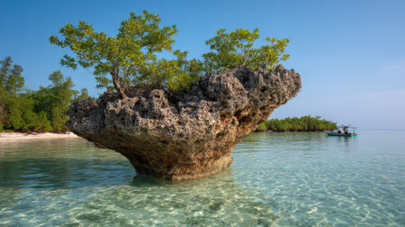 A striking rock formation, topped with verdant trees, emerges from clear ocean water under a bright blue sky. The scene showcases a natural composition with textured rock surfaces and the gentle movement of the water. This image could be used for various commercial projects and editorial content.