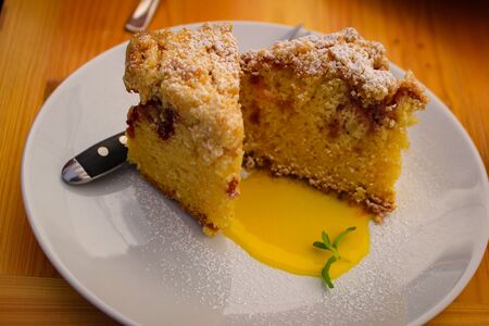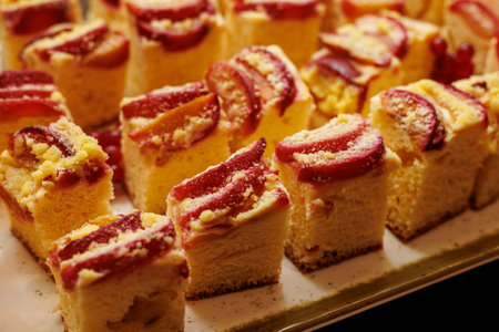 Sponge cake squares with plum topping and crumble
