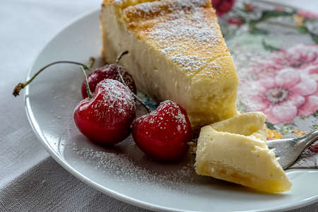 cheesecake and cherries on a white plate and a napkin with flower pattern