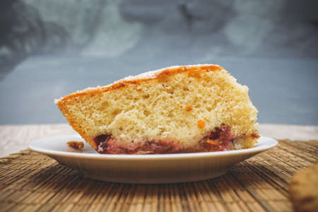 Piece of homemade cake on unusual plate shape with berry decorate on top