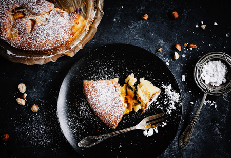 Juicy apricot cake on dark background