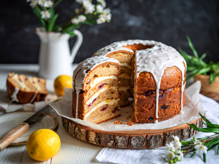 baked Easter cake with white lemon glaze on a white wooden board, baking cut in half