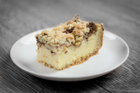 A piece of homemade delicious cheesecake with apple crumble topping served on a white plate