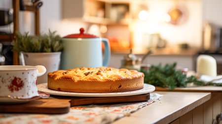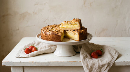 An AI generated illustration of a delicious fruit cake with toppings on the table