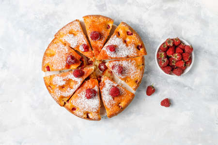 Raspberry cake with powdered sugar and fresh raspberries on a light background. Summer berry dessert.