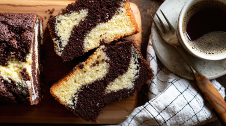 Two slices of marble cake are presented alongside a full coffee cup, a fork, and a slice of cake on a wooden board. The composition utilizes overhead lighting, highlighting the contrasting colors of the cake. This image suits various commercial applications, including culinary and lifestyle themes, suitable for advertising.