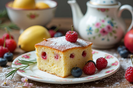 Delicious berry-studded cake with powdered sugar and fresh fruit. That the image is generated using AI.