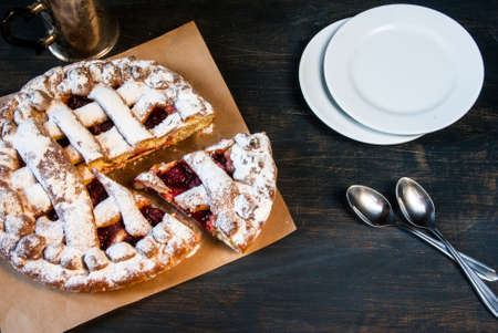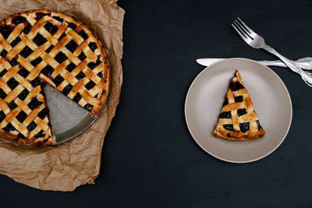 Cherry pie on dark rustic background, top view