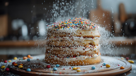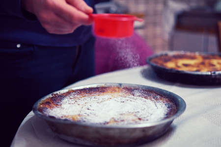 Cake sprinkled with icing sugar on a wooden table in the kitchen