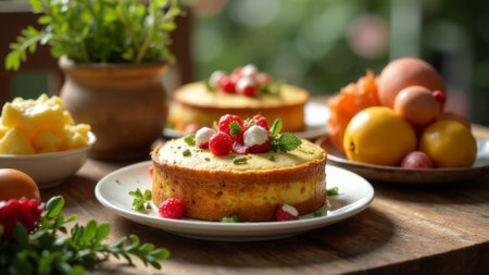 Homemade Easter cake decorated with fresh berries and mint, served on a rustic wooden table with eggs, butter, and fruits. A festive cozy atmosphere perfect for spring celebrations and gatherings