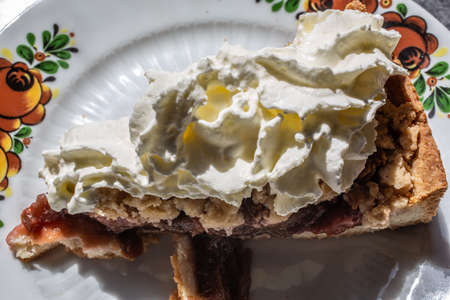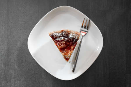 Portion of pie with jam on a white ceramic plate over a white concrete background