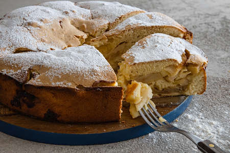 Homemade apple pie, cut into pieces. Delicious pie close-up