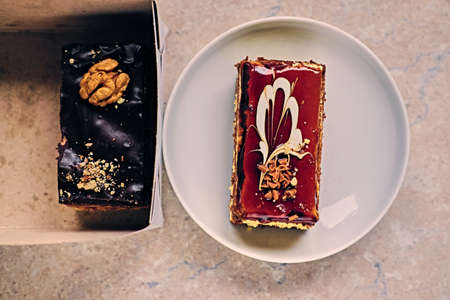 A piece of cake on a plate on the table. Top view, flat lay.