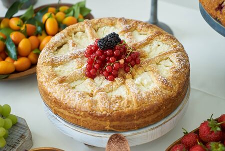 Fresh delicious cake with berries on table, close-up. Homemade cottage cheese biscuit cake with red currants. Summer pie with fruit