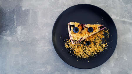 Top view of Blueberry crumble on black dish or plate on gray concrete background with copy space on left. Flat lay of dessert on grey table at café shop. Food handmade with fruit and crackers topping.