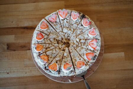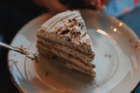 Selective focus close up image of Easter cake, with icing, nuts, seeds, candied fruit, cut and served, natural light, open air abstract background. Easter, birthday, family event celebrating concept
