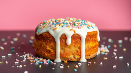 Colorful cake with icing and sprinkles on a dark surface against a pink backdrop