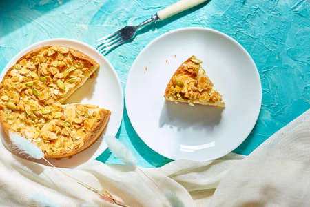 Piece of apple or pear pie, tart with caramel nuts on blue table with sunlight, copy space, top view.