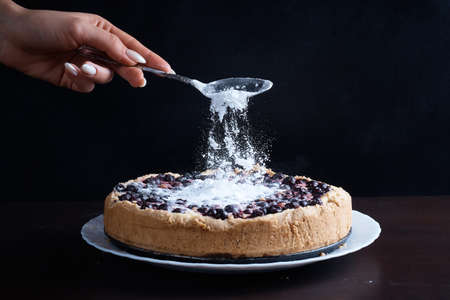 Berry pie cake from the cherries currants in a bowl fresh steaming hot sprinkle with powdered sugar background blurred