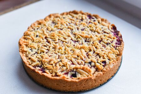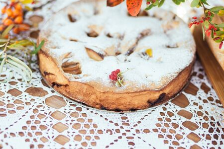 Sweet freshly baked plum pie lies on a white table