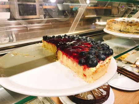 Blueberry cake and fruit chocolate cakes are being served in restaurant
